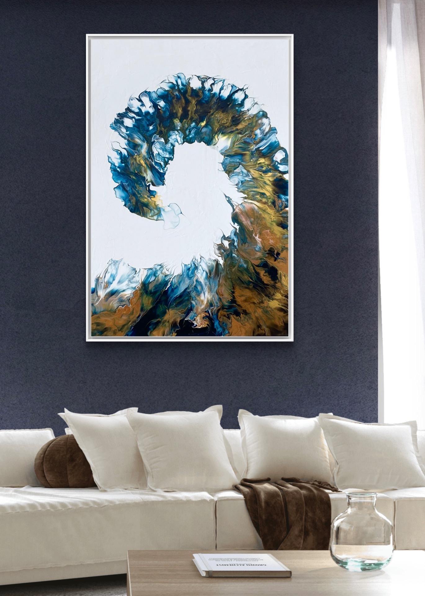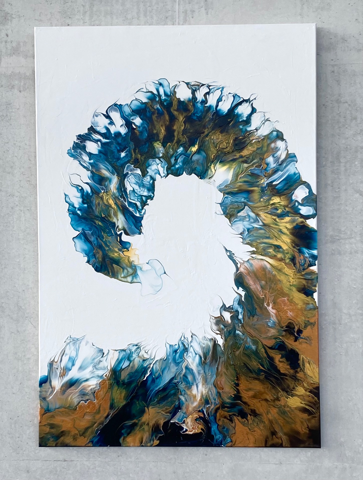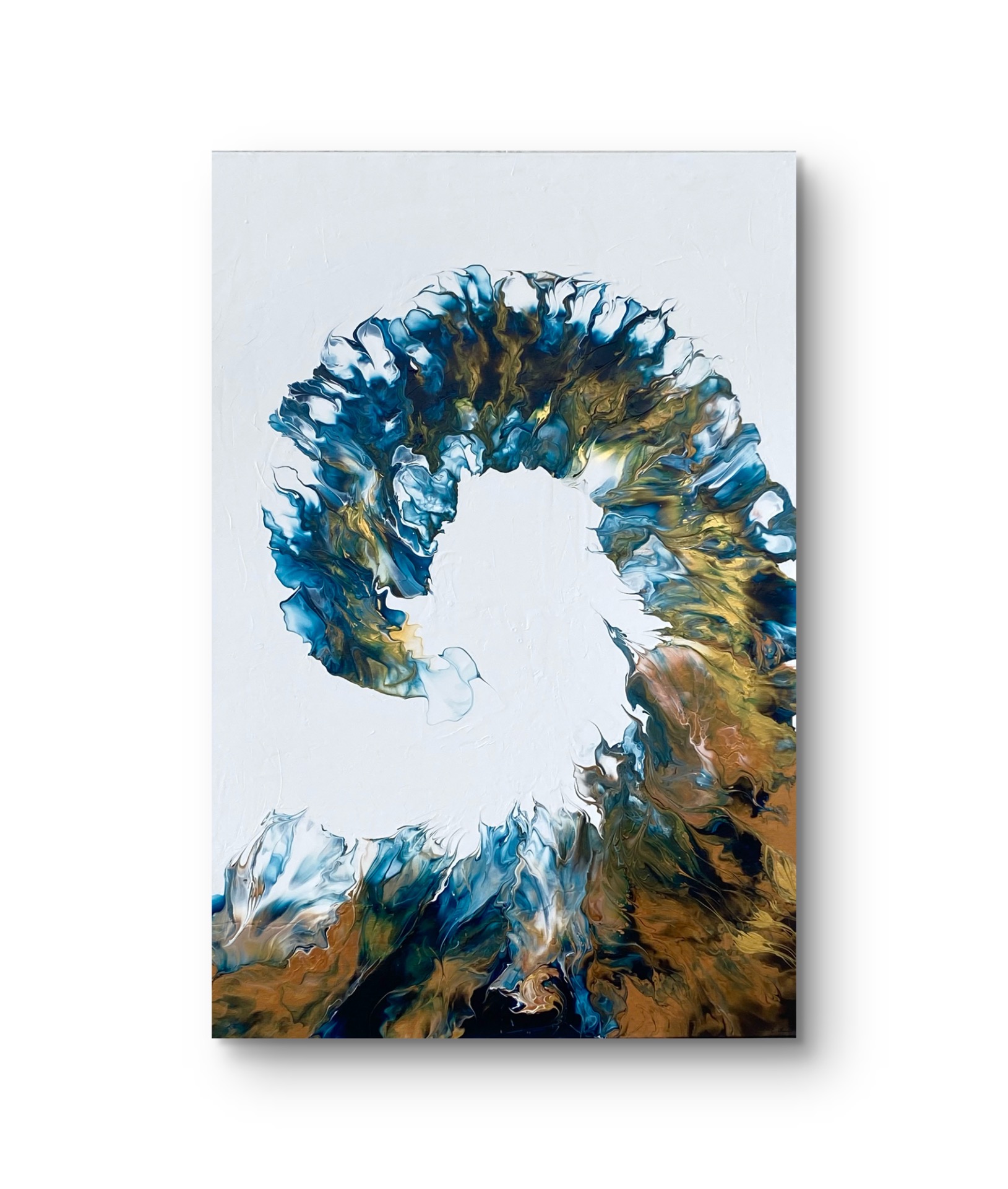 the painting's palette is a mesmerizing blend of blues, copper, and gold, evoking a sense of cosmic wonder. Shapes and forms blend seamlessly, suggesting the gentle dance of spirits as they move in harmony with one another.